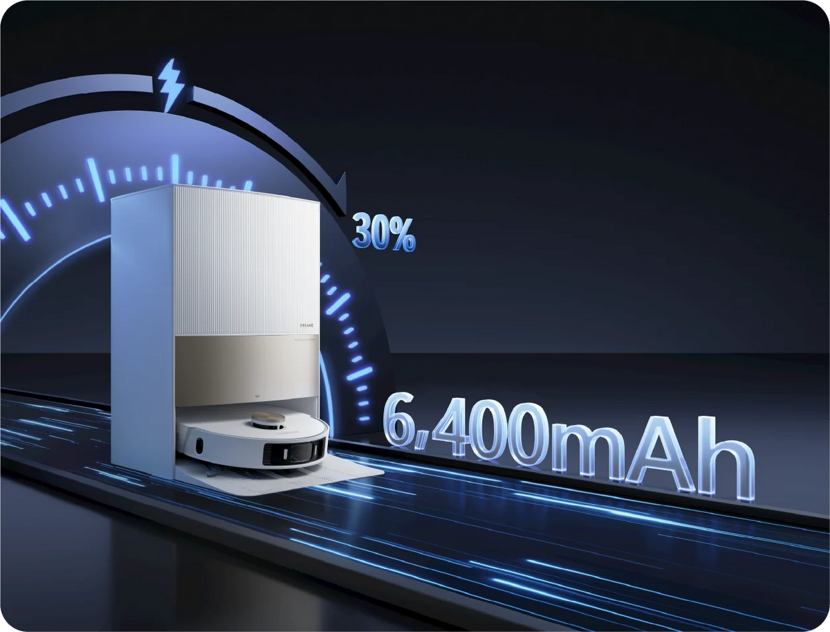 Tehnologia avansată Dreame crește dramatic viteza de încărcare a bateriei mari de 6.400 mAh, astfel încât robotul dvs. este rapid pregătit pentru următoarea curățare.